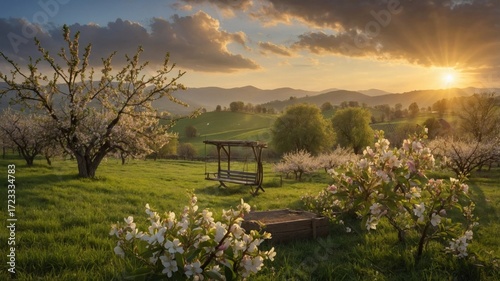 Serene spring landscape with blooming apple trees, a wooden swing, and mountains at sunset