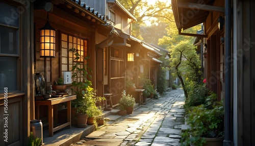 Serene Sunlit Japanese Alley with Lanterns and Plants
