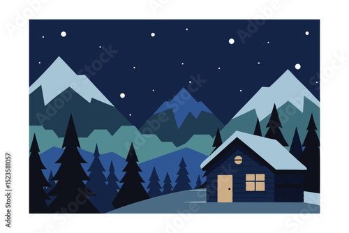 Serene Winter Night Cabin nestled in Majestic Mountainscape Illustration