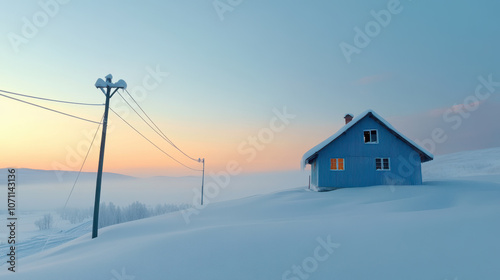serene winter scene featuring snow covered house with warm glow from window, surrounded by tranquil landscape and soft pastel skies