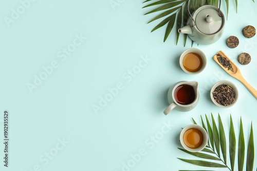 Set for tea ceremony with teapot, cups and tropical leaves on blue background