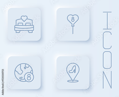 Set line Bedroom, Balloons with 8 March, International Women Day and Woman shoe. White square button. Vector