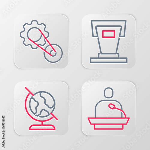 Set line Gives lecture, Earth globe, Stage stand and Timing belt kit icon. Vector