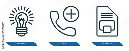 set of 3 linear icons from technology concept. outline icons such as old light bulb, add call, big floppy disk vector