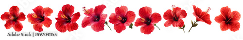 Set of a 3 red hibiscus flowers, isolated on a transparent background.