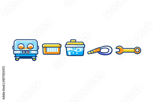 Set of cartoon icons: robot, basket, bucket, audio jack, wrench