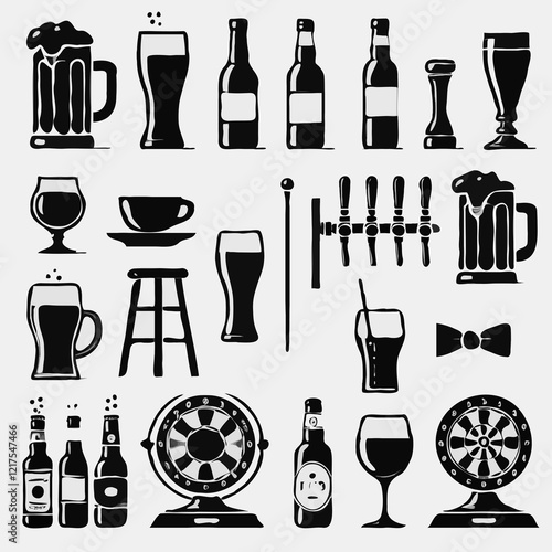 Set of hand drawn drinks icons. Cocktails and drinks set. Black and white illustration, drinks and food. Cocktail, Alcohol, Bottles and glasses, beer, whiskey, cognac, whiskey, wine, whiske
