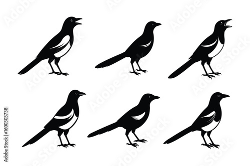 Set of Magpie Silhouette vector, Black Magpie Silhouette