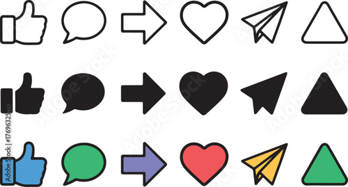 Set of social media icons including thumbs up heart message and share arrows in outline filled and colored styles