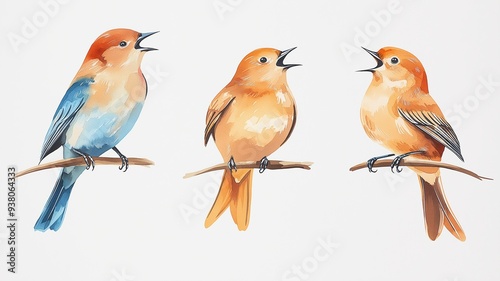 Set of thrushes, perched, singing melodiously, isolated, white background, Watercolor style