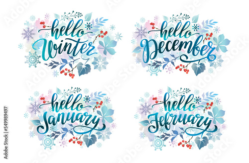 Set of winter phrases Hello Winter, Hello December, January, February. Winter banners with colorful leaves, snowflakes, berries and lettering inscriptions.