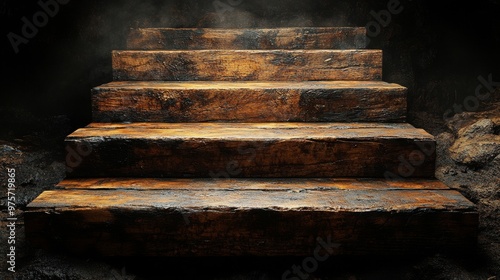 Set of worn, wooden steps ascends through a dark, mysterious environment with a weathered, rustic appearance and eerie atmosphere