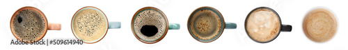 Set with cups of hot aromatic coffee on white background, top view. Banner design