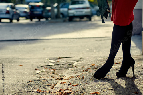 Sexy woman wearing black high heel shoes in city
