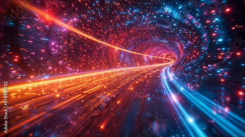Sfondo digitale astratto con particelle e luci colorate che viaggiano alla velocità della luce