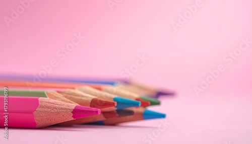 Sharpened colored pencils in vibrant hues pointing forward with dreamy pink-purple bokeh background.