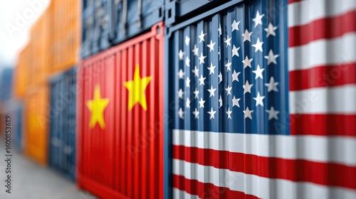 Shipping Containers with American and Chinese Flags in Focus
