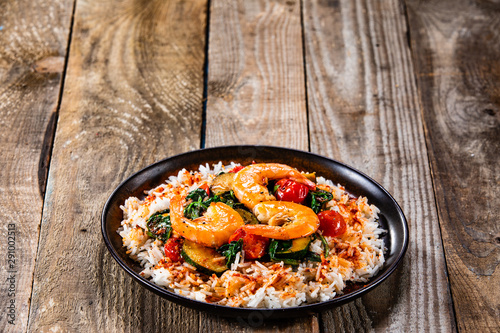 Shrimps with white rice and vegetables on wooden table
