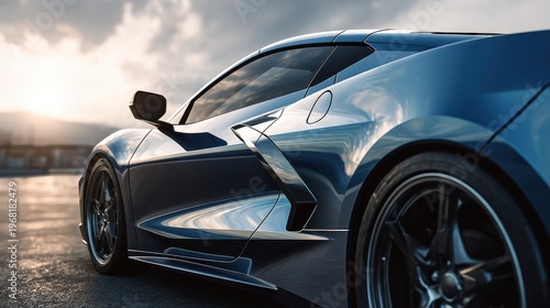 Side view of a new luxury sports car with sleek lines and metallic blue finish