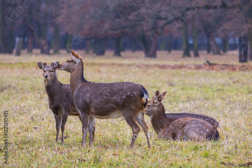 Sika deer - Cervus nippon, doe and mouflon in meadow and forest. Photo from wild nature