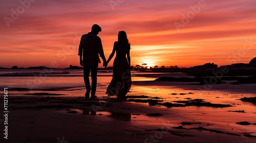 Silhouette of a loving couple holding hands on a sandy beach at sunset with colorful sky and ocean waves