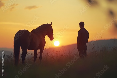 Silhouette of a man and horse against a vibrant sunset in an open field