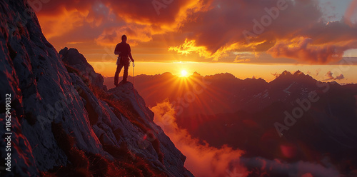 Silhouette of a man climbing a steep mountain at sunrise, with a breathtaking and dramatic landscape. The sky is painted with warm hues of orange, pink, and purple as the first rays of sunlight.