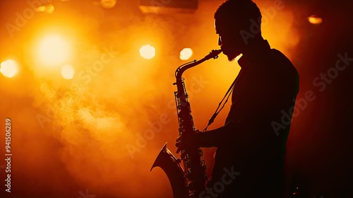 Silhouette of a saxophonist on a jazz stage, warm lighting creating an intimate concert vibe