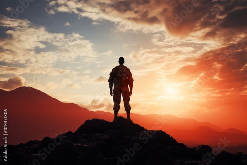 Silhouette of a soldier on a hilltop with a vivid sunset background holding a weapon