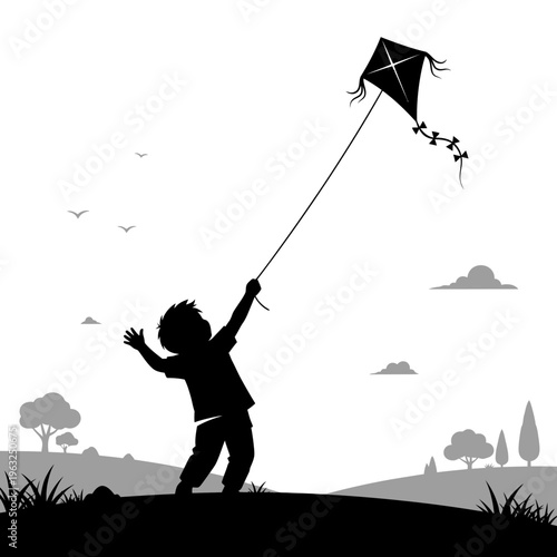 Silhouette of a young boy joyfully flying a kite on a sunny day in a grassy field with trees and clouds.