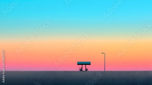 Silhouette of Abandoned Gas Station in Vast Field with Colorful Evening Sky