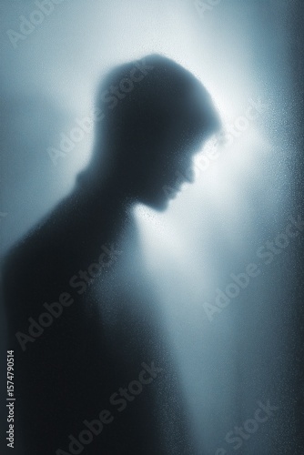 Silhouette of person reflecting on frosted glass evokes memories and deep thought