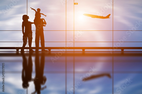 Silhouette of young family and airplane
