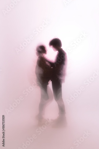 Silhouetted couple embracing in soft light with dreamy atmosphere