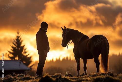 Silhouetted figure stands next to a horse during sunset in a serene rural setting
