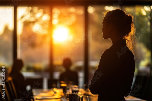 Silhouettes of business people having a meeting in a conference room, with the focus on a woman standing at the table and presenting a project to her team during a presentation Generative AI