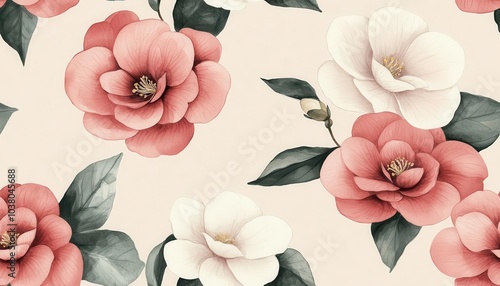 Simple watercolor camellias in soft pink and white tones, arranged on a light beige background, seamless repeat