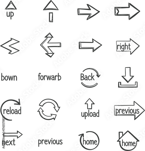 Sketch Doodle Web Navigation Arrows and Icon Set Hand Drawn Style Black and White Vector Symbols