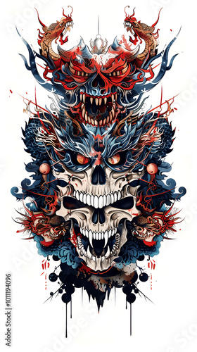 Skull with wings design, blending gothic and vintage elements for a bold tattoo illustration that captures the essence of rock and horror on white background.