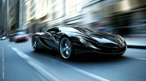 Sleek black and silver car racing through the city, motion blur emphasizing speed and urban surroundings-2