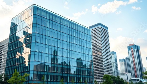 Sleek glass facade of a modern eco-friendly office building in a city skyline, green building, sustainable