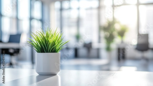 Sleek modern office with a white table, blurred glass walls in the background, creating an open, light-filled environment