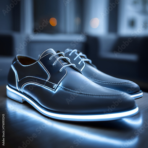 Sleek pair of glowing black formal dress shoes exudes modern style. This futuristic footwear with light sole projects confidence and elegance