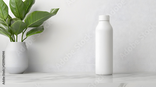 Sleek white water bottle minimalist setting product photography modern environment close-up view clean aesthetic