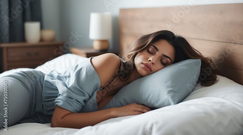 Sleeping beautiful attractive model hispanic young woman on bed from Generative AI