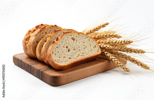 Sliced bread and wheat ears on a wooden board. Fresh baked goods on white background. Natural ingredients for baking. Healthy eating concept.