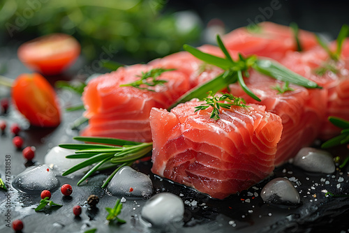 Slices of fresh raw salmon with herbs on a black slate plate