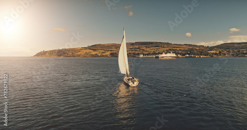 Slow motion of sun ocean gulf with yacht sailing aerial. Sunlight reflection at sea bay. Sailboat at Arran coast, Scotland, Europe. Luxury vessel at summer cruise. Cinematic soft light shot