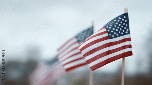 Small American flags ripple wistfully against muted skies, evoking Independence Day nostalgia and Presidents' Day reverence, patriotic flutter whispering freedom