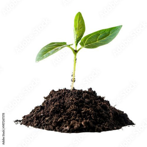 small green plant with two leaves grows from mound of rich, dark soil, symbolizing new beginnings and growth. This captures essence of nature and sustainability